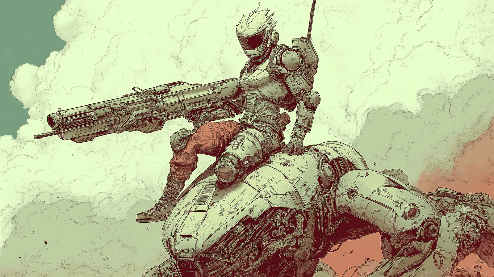 Soldado futurista con arma en tonos verdes vintageSeleccionar opciones Este producto tiene múltiples variantes. Las opciones se pueden elegir en la página de productoCiborg Elegante