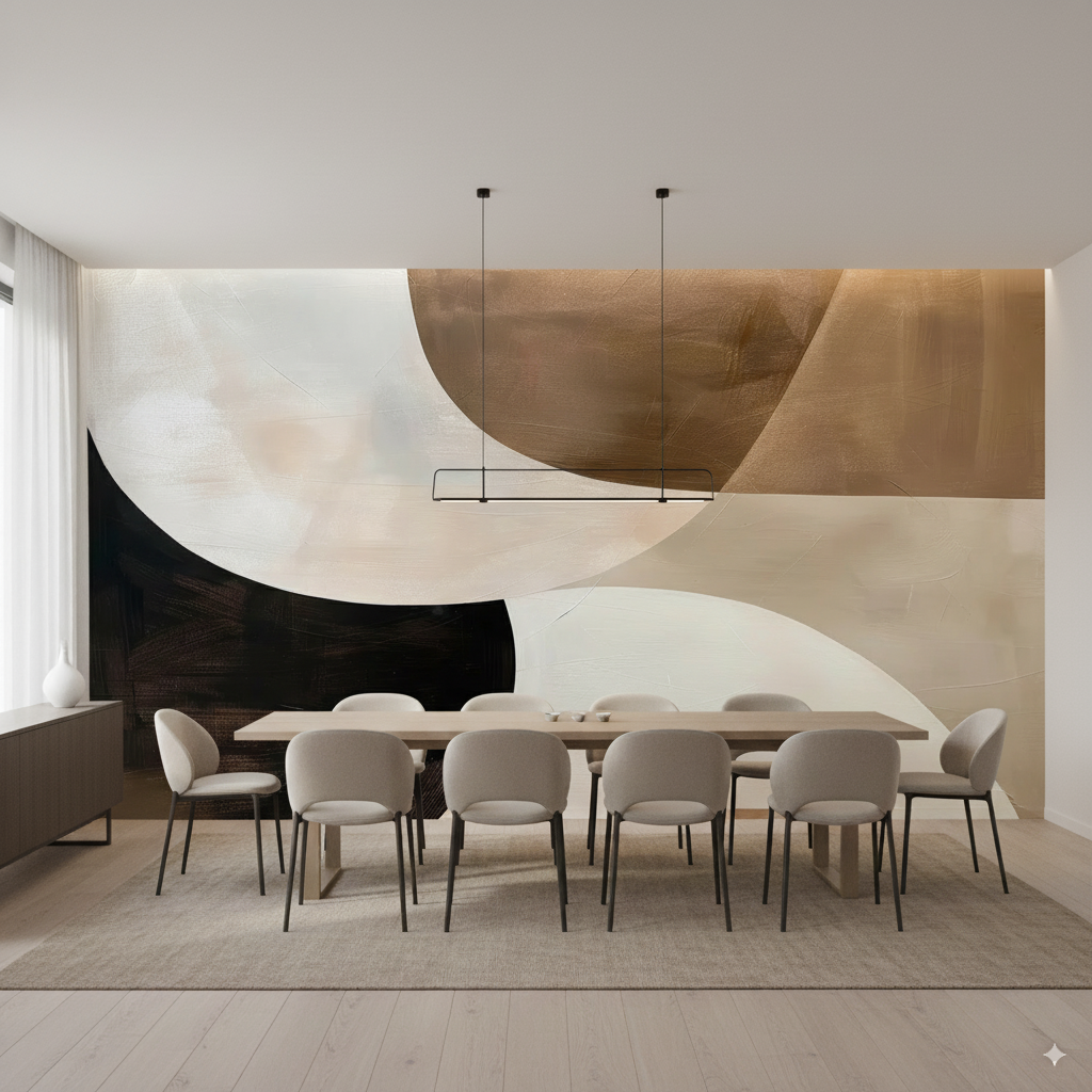 Una obra maestra del diseño contemporáneo que combina formas abstractas fluidas con una paleta de colores cálidos y sofisticados. Los elementos curvos en tonos dorado metálico, tierra y beige se entrelazan creando un movimiento visual dinámico que aporta elegancia y calidez a cualquier ambiente, perfecto para comedores de estilo moderno y minimalista.
