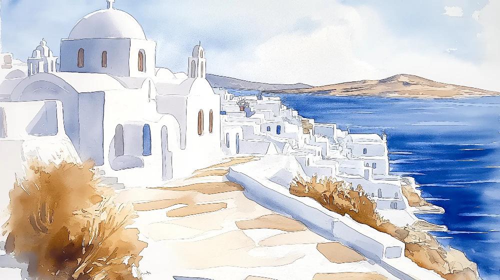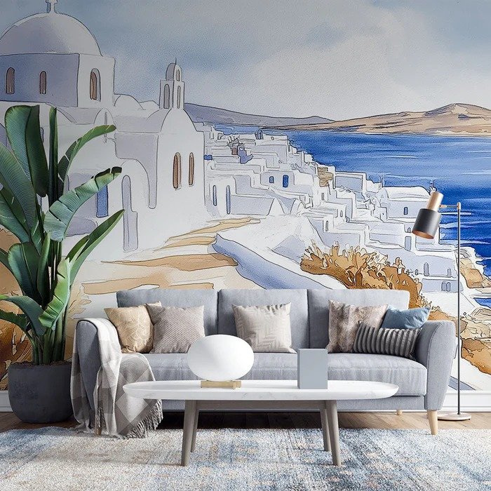 Fotomural en técnica de acuarela que captura la esencia romántica de Santorini, mostrando las casas blancas escalonadas sobre la caldera, el azul intenso del Mar Egeo y las colinas áridas en tonos beige, todo con pinceladas suaves que crean una atmósfera etérea y soñadora.