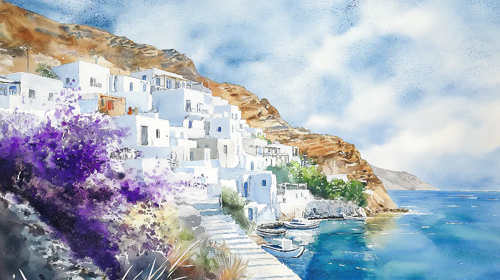 Fotomural delicado en acuarela que muestra las casas blancas de Santorini sobre el acantilado dorado, con abundantes flores moradas de buganvilla en primer plano, el mar turquesa cristalino y un cielo suave con nubes, capturando la luz y los colores característicos de la isla griega.