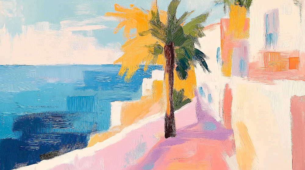 Fotomural de estilo abstracto moderno que fusiona elementos de Santorini con palmeras tropicales, usando pinceladas expresivas en turquesa, amarillo, rosa y azul cobalto para crear una composición vibrante y contemporánea que evoca la energía y el color del Mediterráneo.