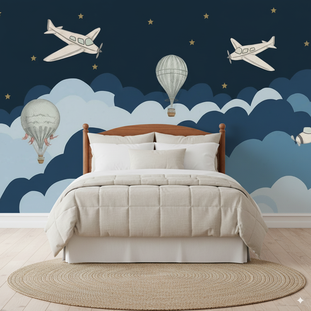 Este cautivador fotomural infantil transforma la habitación en un escenario de aventura nocturna donde la aviación cobra vida bajo un manto estrellado. La composición presenta una flota diversa de aeronaves vintage surcando un cielo nocturno profundo, desde elegantes aviones monomotor y clásicos biplanos hasta majestuosos globos aerostáticos con patrones de rayas delicadas y cestas de mimbre tradicionales.