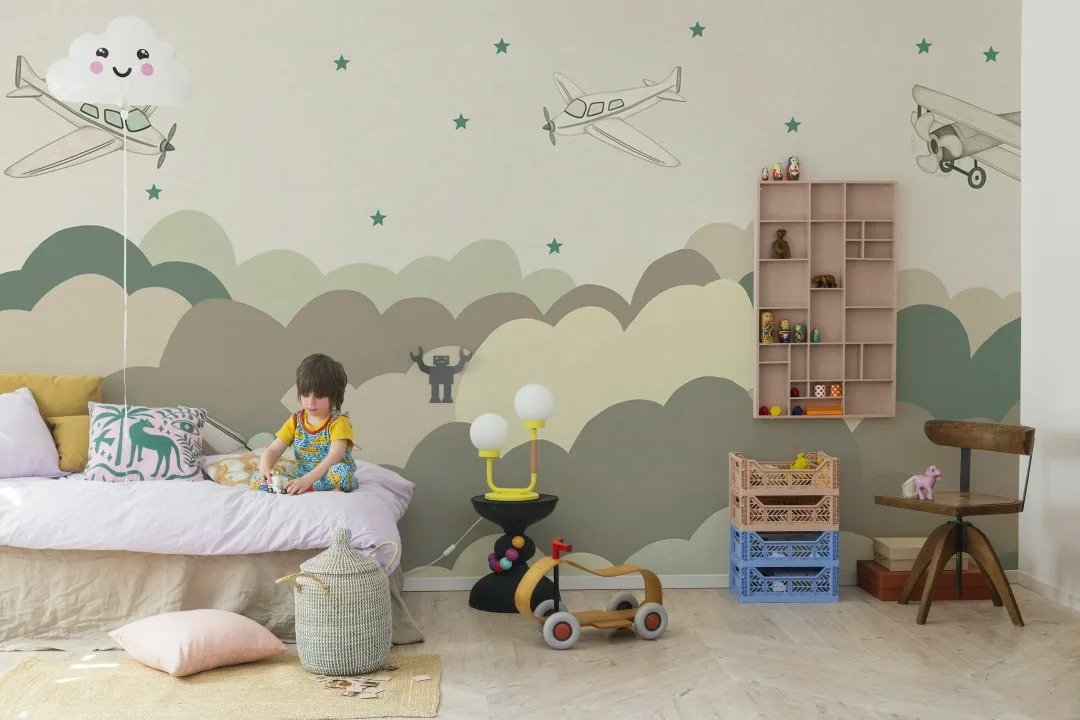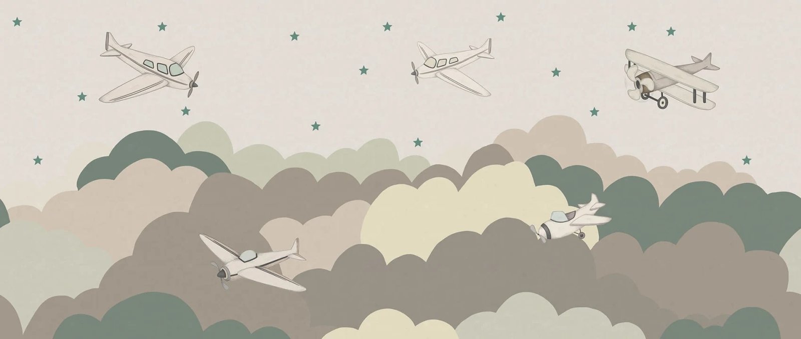 Este elegante fotomural infantil reinventa el tema de la aviación con una paleta cromática contemporánea y sofisticada. La composición presenta una flota de aeronaves vintage navegando a través de un paisaje nuboso estratificado, donde cada capa de nubes se define por una gama cuidadosamente seleccionada de verdes sage, beiges cálidos, grises perla y toques de verde oliva profundo.