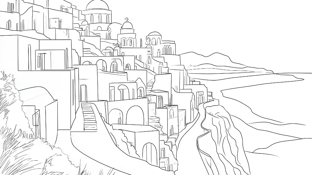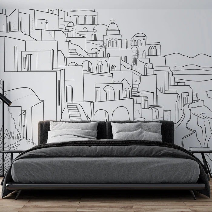 Fotomural estilo boceto arquitectónico que captura la complejidad de Santorini en tonos de gris, mostrando las iglesias con cúpulas, las casas interconectadas, escaleras serpenteantes y la topografía única de la isla con un enfoque artístico que resalta las formas geométricas y orgánicas.