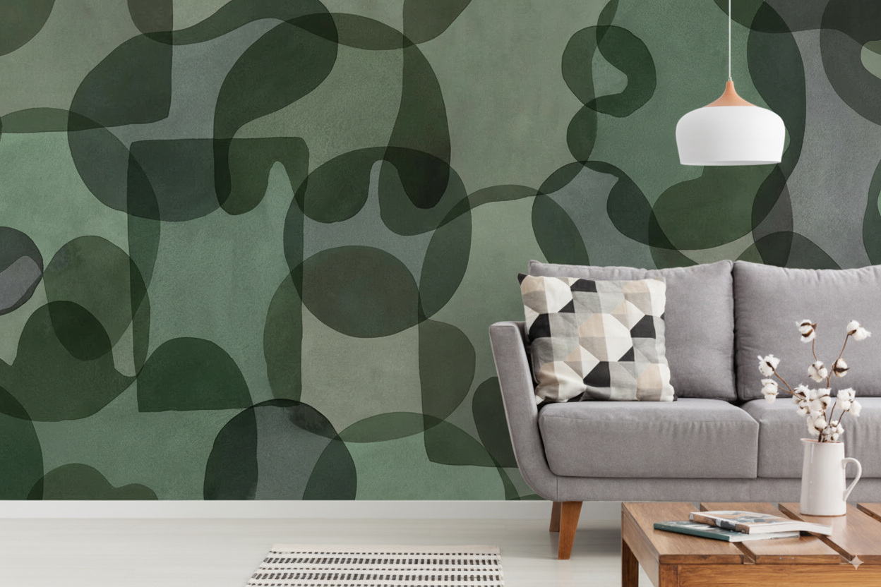 Este evocador fotomural presenta una composición abstracta que recuerda las formas orgánicas y fluidas de la naturaleza, con círculos, óvalos y formas curvas que se entrelazan creando un ritmo visual hipnótico. La paleta monocromática en verdes abarca desde tonos sage y oliva hasta verdes profundos y grises verdosos, todos con diferentes grados de transparencia que generan capas de profundidad y movimiento. Las superposiciones crean efectos de luz y sombra que evocan la sensación de caminar entre la vegetación densa de un bosque o contemplar hojas que se mecen al viento. Este diseño es perfecto para espacios que busquen conectar con la naturaleza de manera sofisticada, ideal para dormitorios, salas de meditación o espacios de trabajo que requieran un ambiente sereno y revitalizante que inspire calma y concentración.