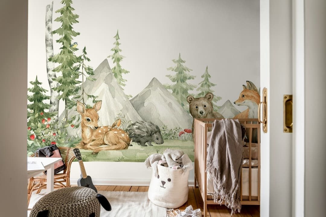 Este encantador fotomural de acuarela presenta una escena idílica del bosque alpino donde un zorro, un osezno, un cervatillo y un pequeño erizo conviven pacíficamente entre altos pinos y majestuosas montañas grises. La composición incluye detalles como pequeñas bayas rojas y hongos que enriquecen el paisaje natural.