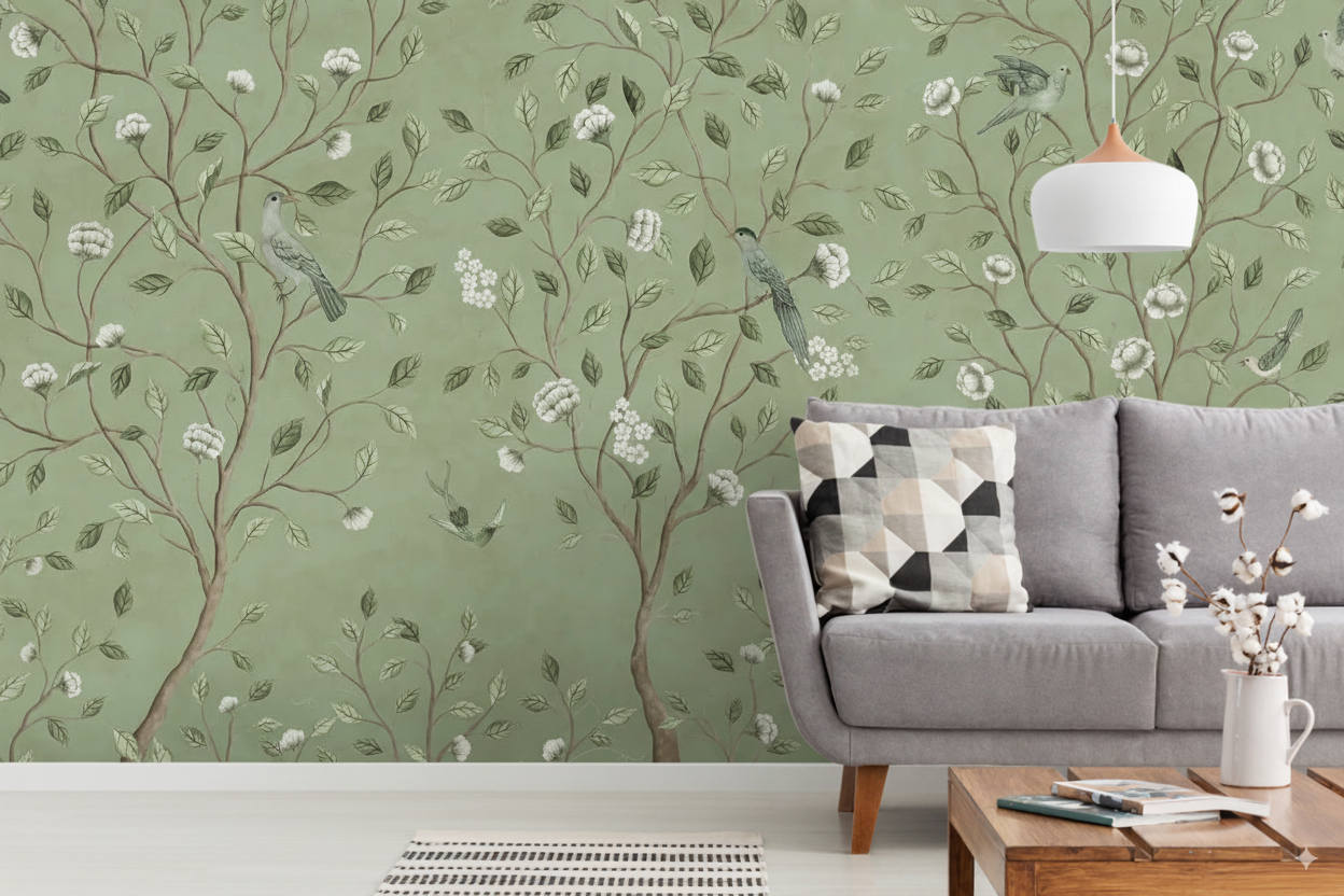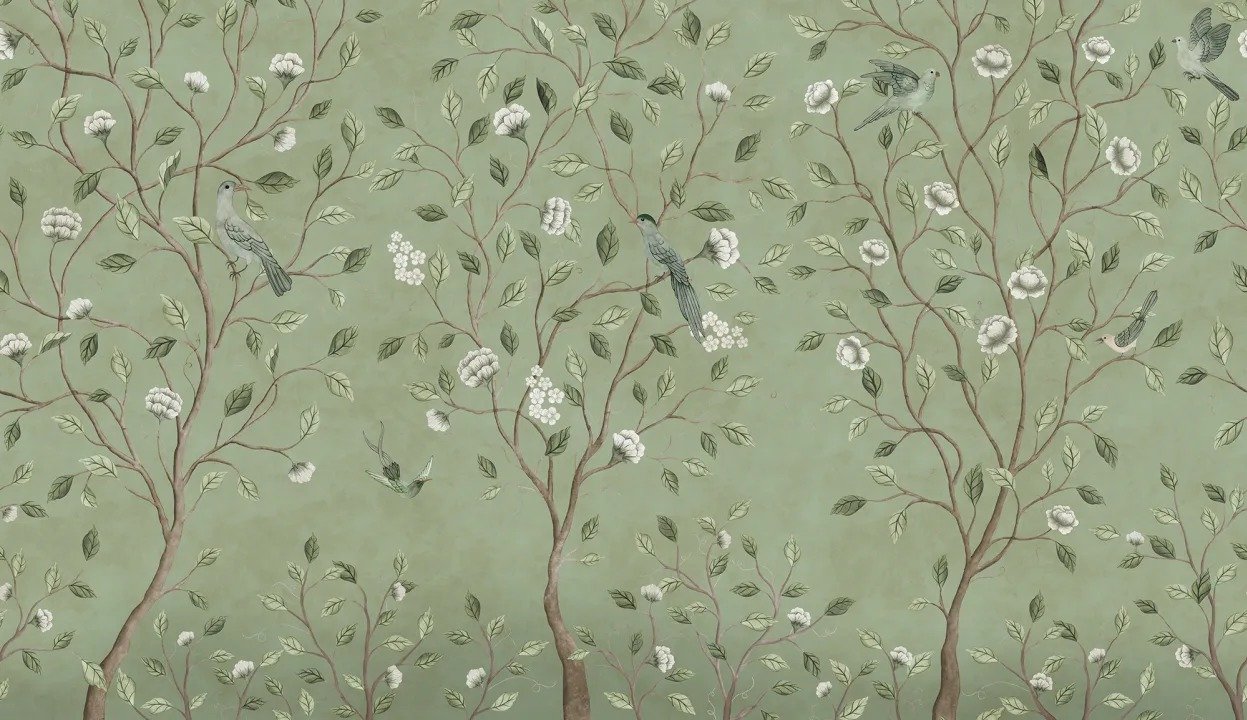 Este elegante fotomural presenta un diseño botánico refinado con delicadas ramas que se extienden graciosamente sobre un suave fondo verde sage. Las flores blancas tipo pompón y los pequeños capullos florales se distribuyen armoniosamente entre el follaje, mientras que aves discretas añaden vida y movimiento al conjunto.