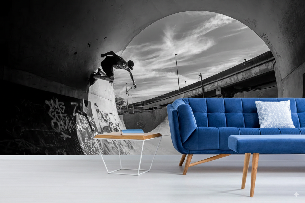 Este dinámico fotomural presenta una fotografía en blanco y negro de alto impacto que captura la esencia pura del skateboarding urbano, mostrando a un skater en plena acción realizando un truco sobre el coping de un bowl de concreto curvado, rodeado de graffitis auténticos y con la infraestructura urbana como telón de fondo. La composición utiliza una perspectiva angular dramática que acentúa las curvas del bowl y la monumentalidad de la escena, mientras que el tratamiento monocromático intensifica los contrastes, las texturas del concreto desgastado y la expresión cruda de la cultura skate.