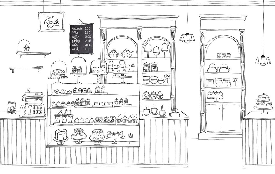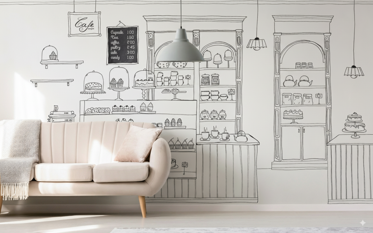 Este delicioso fotomural presenta una ilustración detallada en líneas negras de una acogedora cafetería tradicional, capturando toda la calidez y el encanto de estos espacios gastronómicos. La composición muestra vitrinas llenas de pasteles y dulces, estanterías con productos artesanales, una caja registradora vintage, menú en pizarra y todos los elementos que hacen especial a una cafetería clásica. El estilo de ilustración lineal minimalista en blanco y negro aporta elegancia y versatilidad, mientras que los múltiples detalles crean una atmósfera nostálgica y acogedora. Perfecto para decorar cocinas, comedores, cafeterías reales o cualquier espacio que busque recrear la atmósfera cálida y familiar de estos entrañables establecimientos gastronómicos.