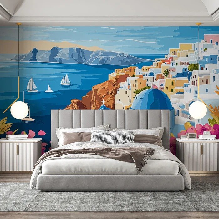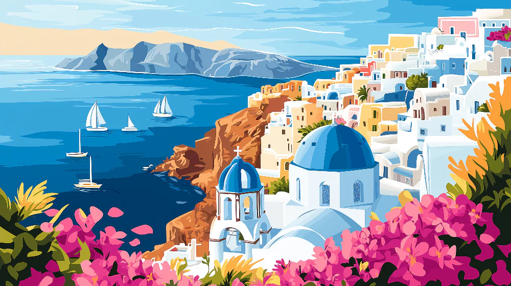 Fotomural panorámico de estilo ilustración que captura la vista más emblemática de Santorini, con las casas blancas y coloridas escalonadas sobre el acantilado, la cúpula azul característica, veleros en la caldera, flores fucsia y palmeras, todo en una composición equilibrada con colores vibrantes y luminosos.