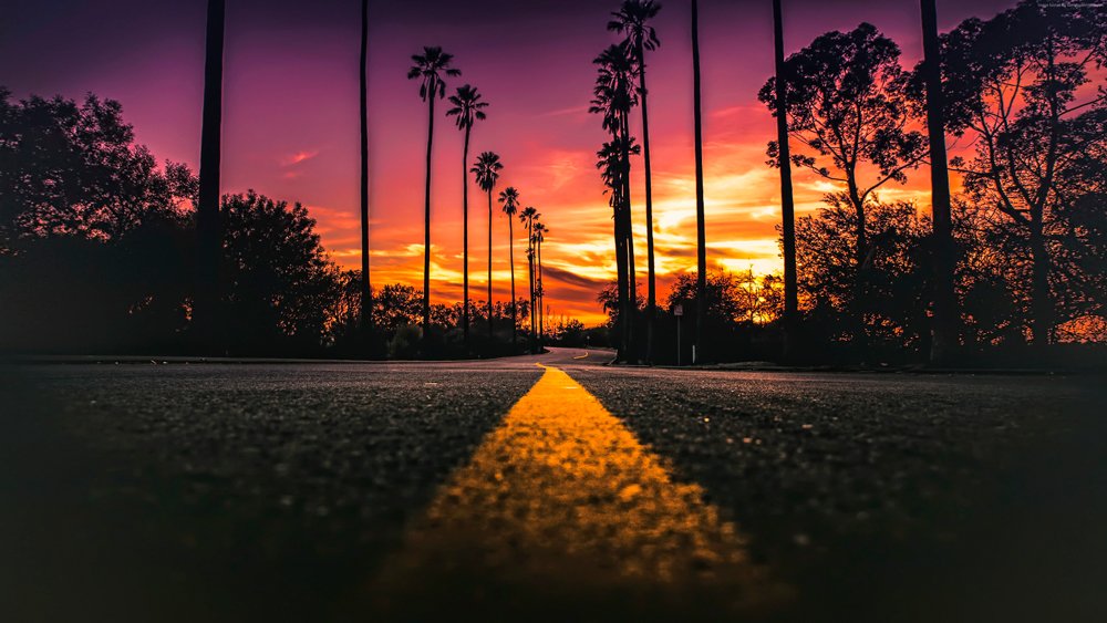 Fotomural que captura la esencia del sueño californiano con una carretera que se pierde en el horizonte, palmeras altas recortadas contra un cielo en tonos púrpura, naranja y dorado durante la hora mágica del atardecer.