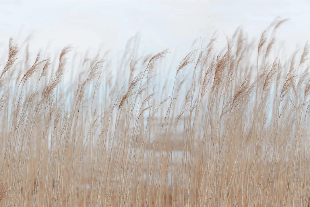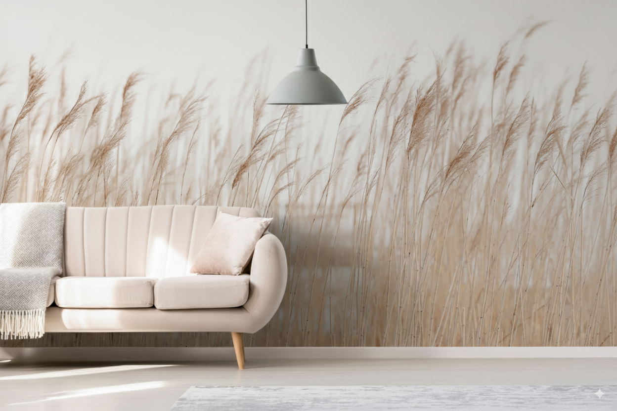Un fotomural que captura la serenidad de un campo de cañas o juncos en tonos dorados, creando una sensación de movimiento suave como si fueran mecidas por una brisa gentil. Los colores cálidos en beige y dorado, junto con el cielo suave y difuminado, generan una atmósfera calmante y orgánica perfecta para espacios que buscan conectar con la naturaleza y transmitir una sensación de paz y armonía natural.