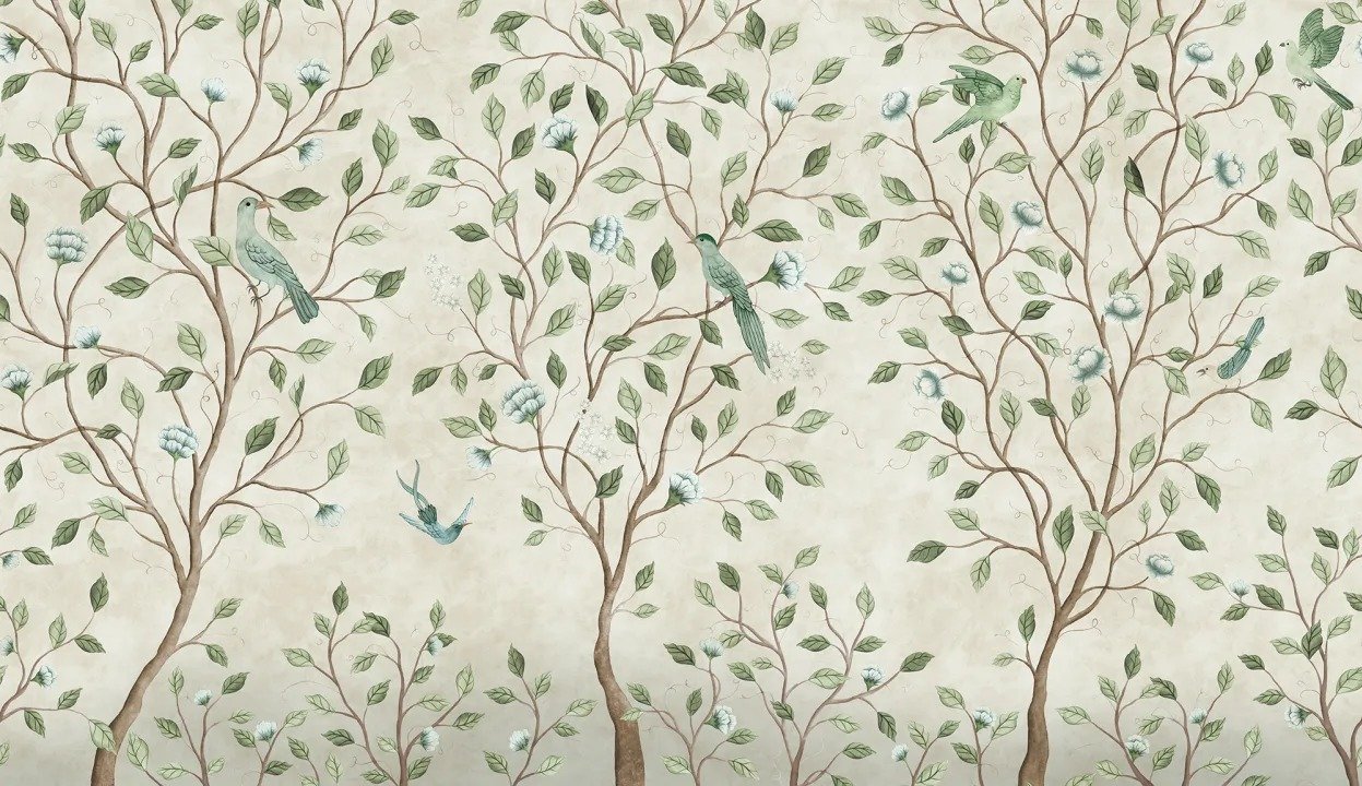 Este refinado fotomural rinde homenaje al arte decorativo chinoiserie tradicional con su elegante composición de ramas entrelazadas, hojas verdes y delicadas aves en tonos azul grisáceo. Sobre un fondo neutro cremoso, las flores blancas y azules se distribuyen armoniosamente creando un patrón repetitivo que evoca los lujosos papeles pintados de las casas señoriales, aportando distinción y elegancia atemporal a cualquier espacio.