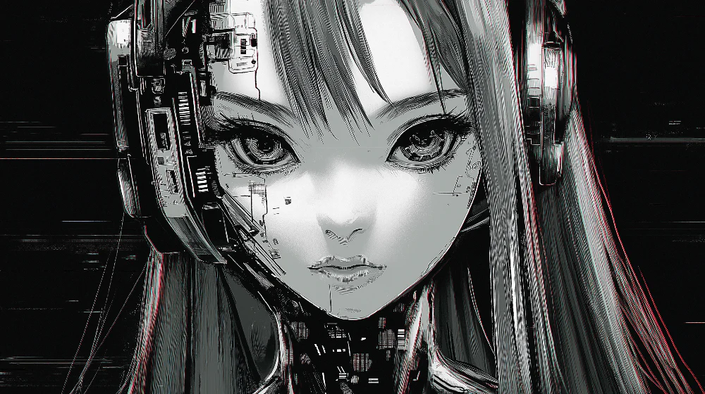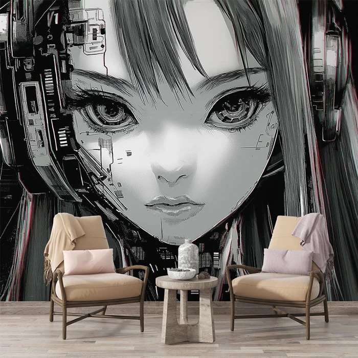 Fusión entre humanidad y tecnología con trazos refinados en blanco y negro. Ideal para espacios juveniles que buscan equilibrio entre lo orgánico y lo sintético con estética futurista.