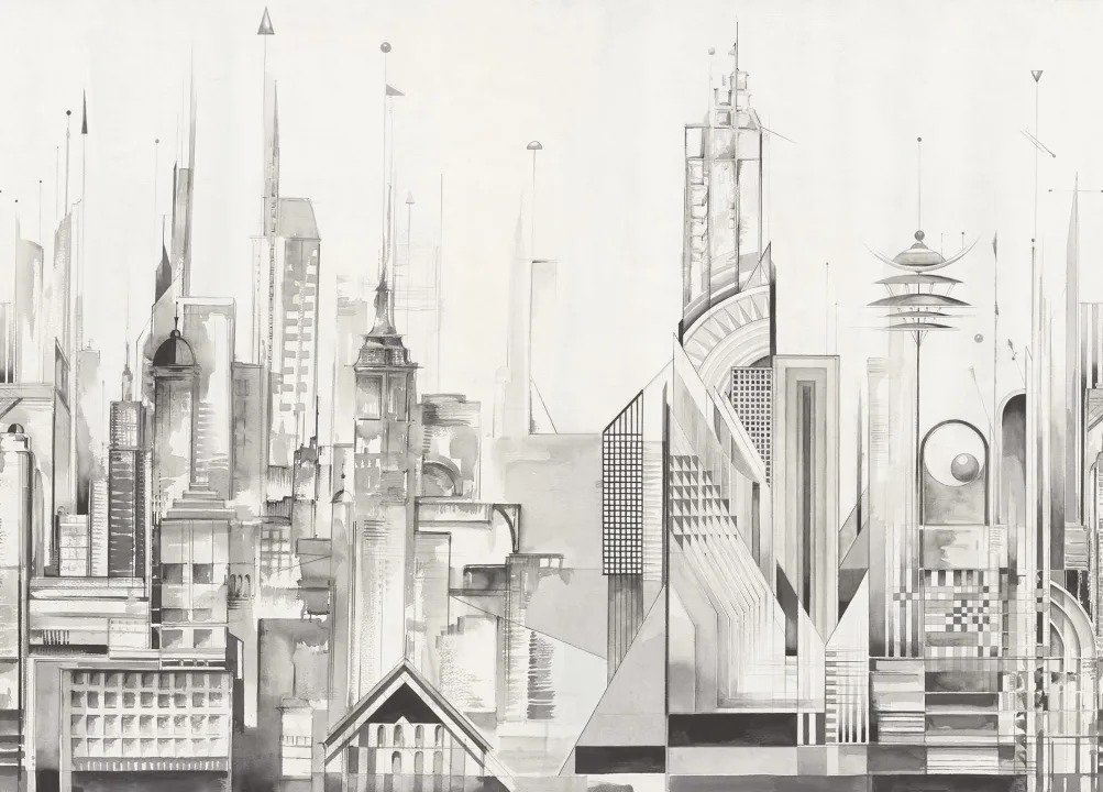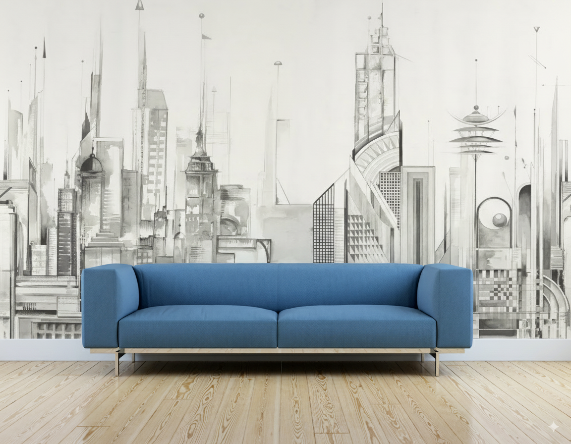 Este impresionante fotomural arquitectónico presenta una visión cautivadora de la ciudad del futuro, renderizada completamente en una elegante paleta monocromática de grises que va desde el blanco puro hasta el carbón profundo. La composición revela un skyline urbano extraordinario donde la imaginación arquitectónica cobra vida a través de estructuras imposibles y diseños vanguardistas que desafían las convenciones tradicionales.