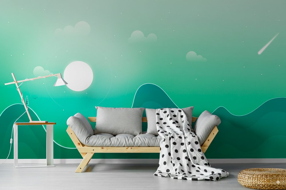 Sumérgete en la tranquilidad con este fotomural minimalista que presenta suaves colinas verdes bajo una luna luminosa y serena. Una estrella fugaz solitaria añade un toque de magia celestial a esta obra de arte digital simple pero profundamente cautivadora. Los colores relajantes y las líneas suaves crean una atmósfera de calma absoluta, perfecta para transformar cualquier ambiente en un oasis de paz. Este diseño minimalista combina la simplicidad de las formas con la belleza nocturna, ofreciendo una experiencia visual que eleva el espíritu y aporta serenidad a espacios contemporáneos que buscan armonía y contemplación.