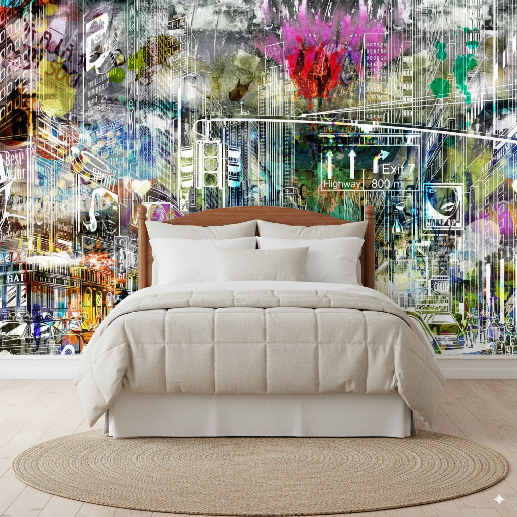 Este dinámico fotomural presenta un arte digital contemporáneo caracterizado por un collage urbano complejo que mezcla elementos arquitectónicos, señales de tráfico, tipografías, colores neón vibrantes y texturas digitales superpuestas, creando una representación abstracta y energética de la vida metropolitana moderna. La composición combina referencias a la cultura urbana, la arquitectura citadina y la estética digital, con una paleta que incluye azules eléctricos, verdes neón, magentas intensos, amarillos brillantes y contrastes en blanco y negro, todo ello atravesado por líneas, códigos y elementos gráficos que evocan la velocidad y el dinamismo de las grandes ciudades. Este diseño de alta complejidad visual y estética street art digital es perfecto para espacios juveniles, estudios creativos, oficinas de diseño, lofts urbanos, espacios de coworking modernos o cualquier ambiente que busque capturar la esencia cosmopolita y tecnológica contemporánea, aportando una declaración artística audaz que refleja la intersección entre arte, tecnología y cultura urbana actual.