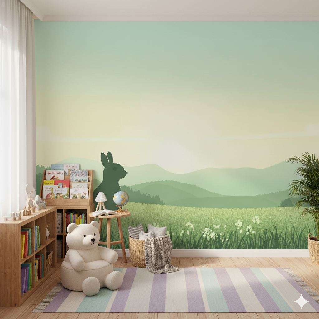 Un fotomural contemplativo que presenta la silueta de un conejo observando un vasto paisaje de montañas verdes que se desvanecen en la distancia. Los tonos verdes suaves y la composición minimalista crean una sensación de paz y serenidad, perfecta para fomentar momentos de calma y reflexión en espacios infantiles, inspirando la conexión con la naturaleza.