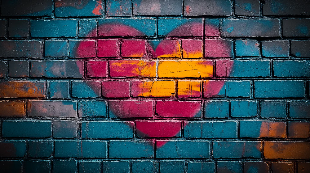 Impresionante mural que simula pared de ladrillos con corazón pintado en tonos turquesas, rosas y amarillos. Efecto realista de textura y profundidad. Ideal para espacios juveniles o creativos que buscan autenticidad urbana.