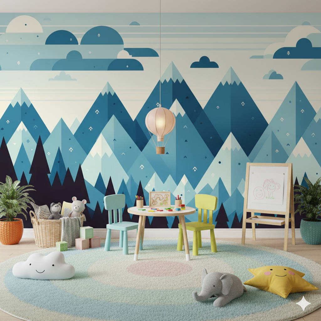 Este moderno fotomural reinterpreta el paisaje montañoso a través de un lenguaje visual minimalista y geométrico que resulta tanto contemporáneo como atemporal. La composición presenta múltiples cordilleras superpuestas representadas mediante formas triangulares y poligonales en diversos tonos de azul, desde azul cielo hasta navy profundo, creando un efecto de capas que sugiere infinita profundidad. Cada montaña incorpora patrones decorativos sutiles – puntos, líneas, pequeños símbolos geométricos – que añaden textura visual sin comprometer la simplicidad del diseño. El cielo incluye nubes estilizadas como formas redondeadas en diferentes tonalidades de azul y un sol parcialmente visible que aporta calidez a la paleta fría. La base del paisaje se resuelve con formas más oscuras que sugieren bosques o valles profundos, proporcionando peso visual y contraste. Este fotomural es perfecto para habitaciones infantiles modernas donde se valora la estética clean y contemporánea, ideal para niños que responden bien a ambientes ordenados y visualmente tranquilos, y para espacios que buscan una decoración que evolucione con el crecimiento del niño.