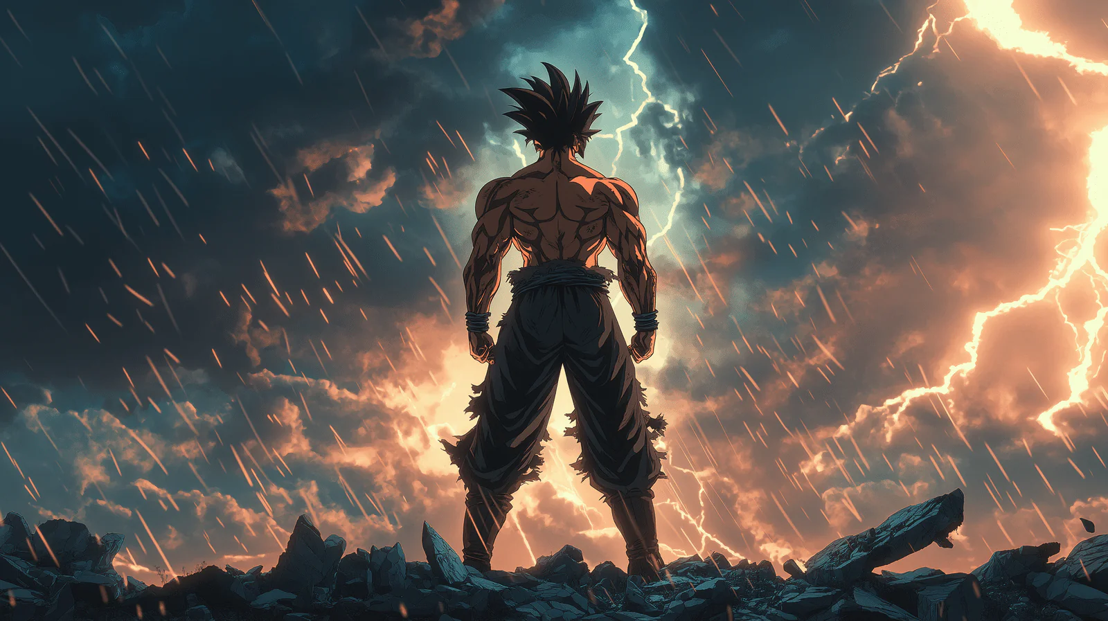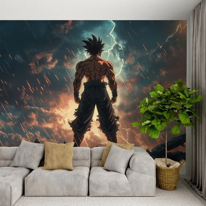 Composición épica con figura imponente frente a cielo tormentoso en tonos naranjas y azules dramáticos. Perfecto para jóvenes que buscan inspiración y fuerza en su espacio personal con estética cinematográfica.