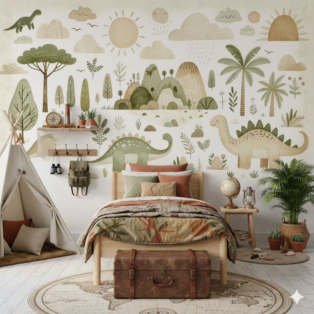 Embárcate en una emocionante expedición prehistórica con este cautivador fotomural que combina dinosaurios con elementos de aventura y exploración. El diseño presenta una escena completa de safari dinosaurio donde especies como Brontosaurios y Estegosaurios habitan en un paisaje tropical lleno de palmeras, árboles frondosos, montañas y nubes con expresiones amigables que añaden un toque de ternura. La paleta de colores en tonos verdes, beiges y ocres crea una atmósfera natural y orgánica que evoca las expediciones de los grandes exploradores. El fotomural incluye elementos vintage como brújulas, mapas y referencias a la exploración que fomentan el espíritu aventurero en los niños. El cielo presenta un sol radiante y nubes con caritas sonrientes, mientras que la vegetación exuberante enmarca toda la composición. Este diseño es perfecto para habitaciones de niños que sueñan con ser paleontólogos o exploradores, creando un ambiente que inspira curiosidad, aprendizaje y aventura.