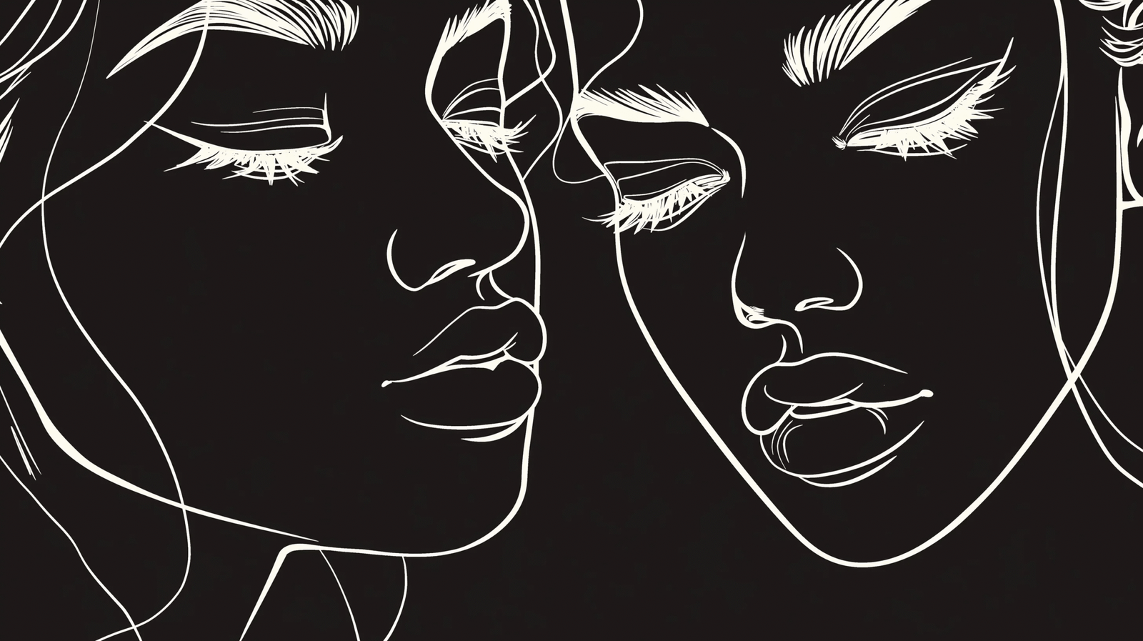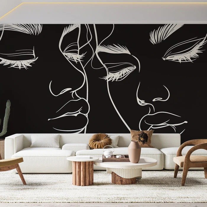 Fotomural dramático con fondo negro que presenta dos rostros femeninos en composición íntima. Las líneas blancas definen pestañas, labios y contornos faciales creando un contraste elegante y una atmósfera romántica y sofisticada.