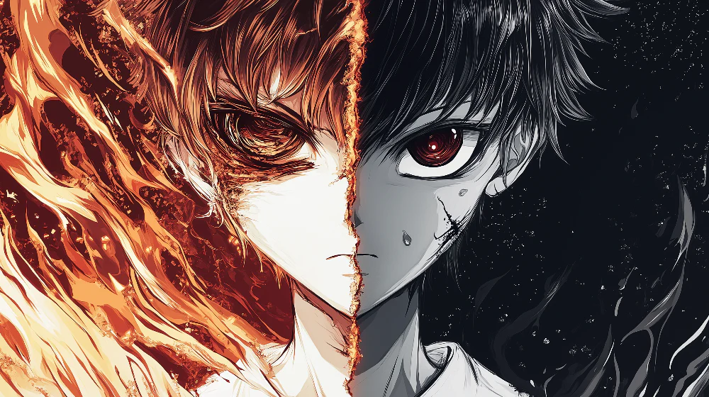 Diseño dramático que muestra transformación con llamas naranjas y negras en composición simétrica. Perfecto para jóvenes que buscan representar conflicto interno y poder en su decoración.