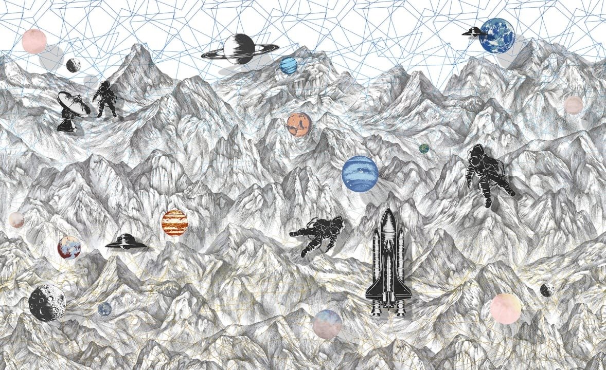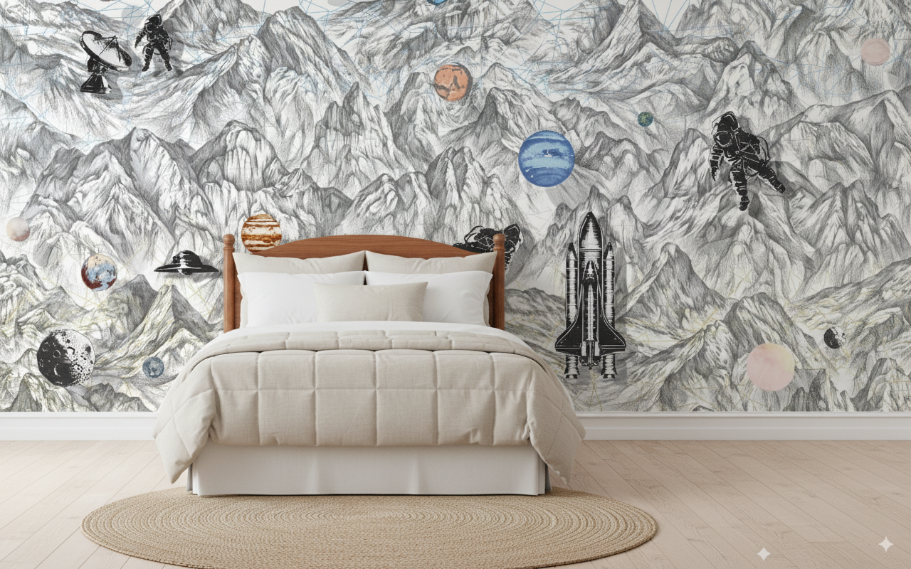 Este impresionante fotomural fusiona la majestuosidad de un paisaje montañoso con la fascinación del espacio exterior, creando una composición única y moderna. Las montañas están renderizadas en elegantes tonos grises y blancos con un estilo detallado y realista, mientras que el fondo presenta un patrón geométrico de líneas azules sutiles que aportan dinamismo sin resultar abrumador. La escena se enriquece con elementos espaciales dispersos: astronautas en trajes negros flotando entre los picos, planetas de diversos colores y texturas (incluyendo la Tierra, Júpiter y otros cuerpos celestes), naves espaciales futuristas y cohetes que sugieren exploración intergaláctica. La paleta de colores combina la sobriedad de los grises montañosos con toques de color en los elementos planetarios, creando un equilibrio perfecto entre lo terrenal y lo cósmico. Es ideal para espacios que busquen inspirar curiosidad científica y aventura, perfecto tanto para habitaciones juveniles como para ambientes modernos y sofisticados.