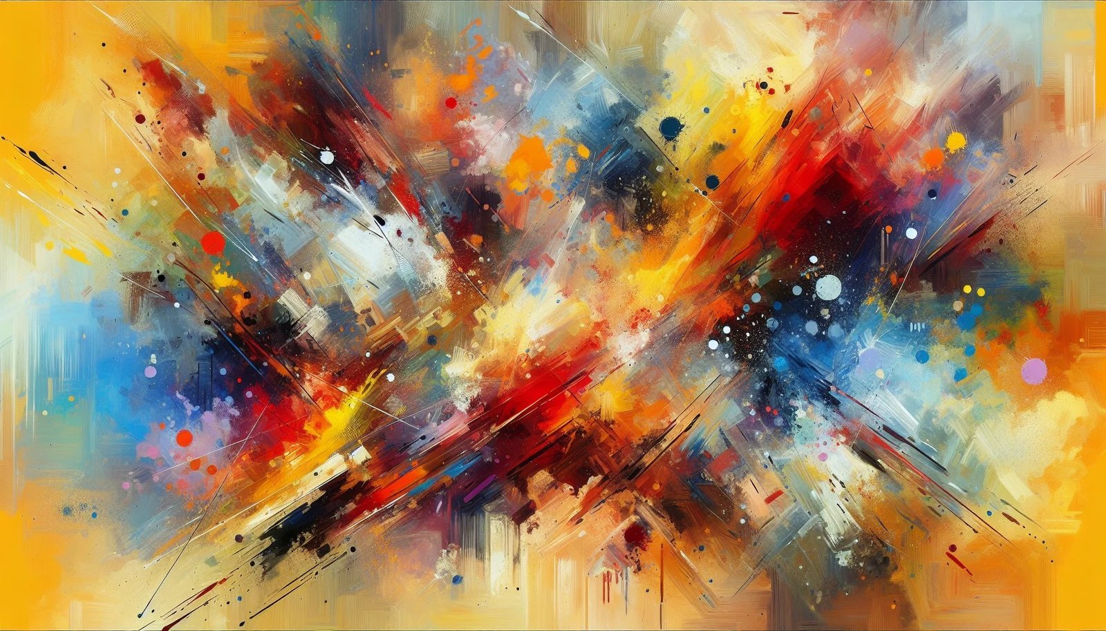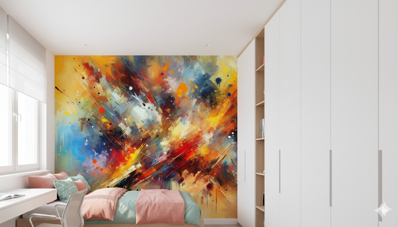 Espectacular fotomural de arte abstracto con pinceladas expresivas en amarillo, naranja, azul y rojo que crean una composición dinámica. El efecto de salpicaduras y movimiento diagonal aporta energía y modernidad, ideal para dormitorios juveniles creativos.