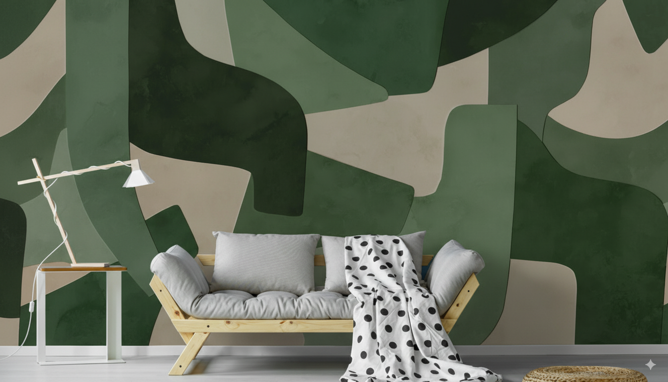 Este elegante fotomural presenta una composición abstracta contemporánea que combina formas orgánicas y fluidas en una paleta cromática sofisticada de verdes profundos, tonos sage y beige suave. Las formas curvilíneas se entrelazan de manera armoniosa, creando un diseño que evoca la naturaleza de forma estilizada y moderna. Su estética minimalista y refinada lo convierte en la elección perfecta para espacios que buscan un toque artístico sin resultar abrumador, aportando calma visual y un aire de sofisticación contemporánea que complementa tanto interiores modernos como espacios de estilo escandinavo o natural.