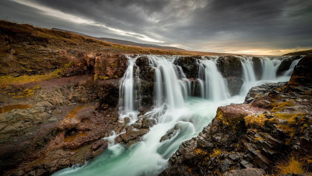 Esta impresionante fotografía captura la esencia salvaje y primordial del paisaje islandés en Kolugljúfur, una de las cascadas más fotogénicas de la isla. El agua se precipita en múltiples torrentes sobre un anfiteatro natural de roca volcánica, creando una sinfonía visual de poder y movimiento que ha sido suavizada mediante técnica de larga exposición, transformando el agua turbulenta en cortinas sedosas de color turquesa y blanco.