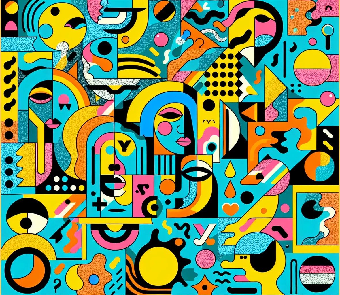 Vibrante fotomural de arte geométrico con rostros cubistas, formas orgánicas y abstractas en turquesa, amarillo, rosa, naranja y negro. Inspirado en el pop art y el modernismo, ideal para espacios juveniles que buscan color, energía y diseño contemporáneo.