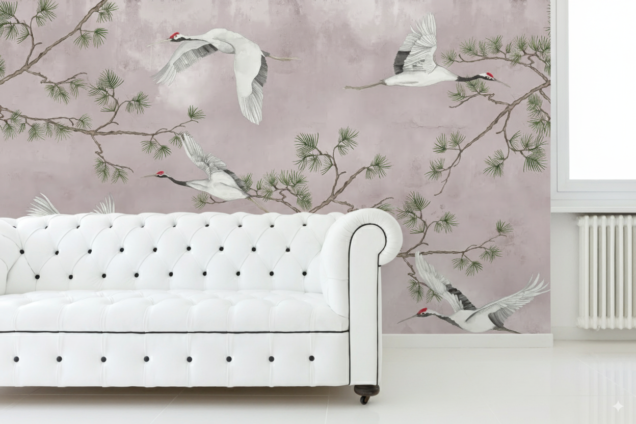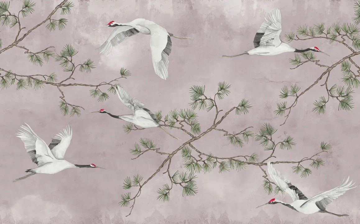 Elegante fotomural de grullas blancas volando entre ramas de pino sobre un fondo suave en tonos malva, inspirado en el arte tradicional asiático.