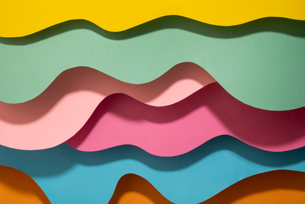 Este espectacular fotomural presenta un diseño abstracto moderno caracterizado por capas onduladas horizontales que se superponen creando un efecto tridimensional fascinante, con una paleta de colores vibrante y alegre que incluye amarillo brillante, verde menta suave, tonos rosa coral y fucsia intenso, junto con azul turquesa y detalles en naranja cálido. Las formas orgánicas fluyen de manera armoniosa, evocando paisajes estilizados o formaciones geológicas abstractas, mientras que los suaves gradientes y las sombras proyectadas entre las capas aportan profundidad y movimiento visual.