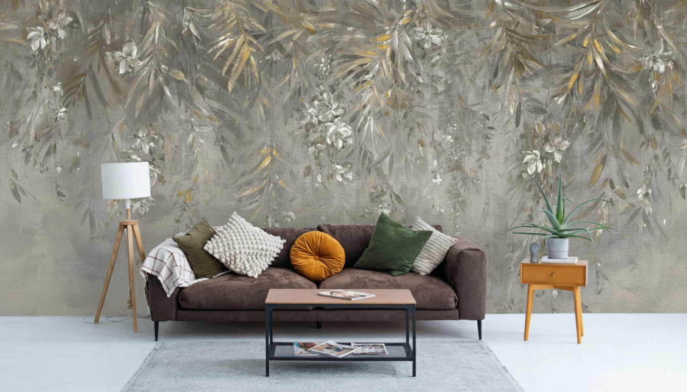 Fotomural artístico con follaje colgante en tonos grises y dorados sobre fondo texturizado, creando un efecto de jardín misterioso.