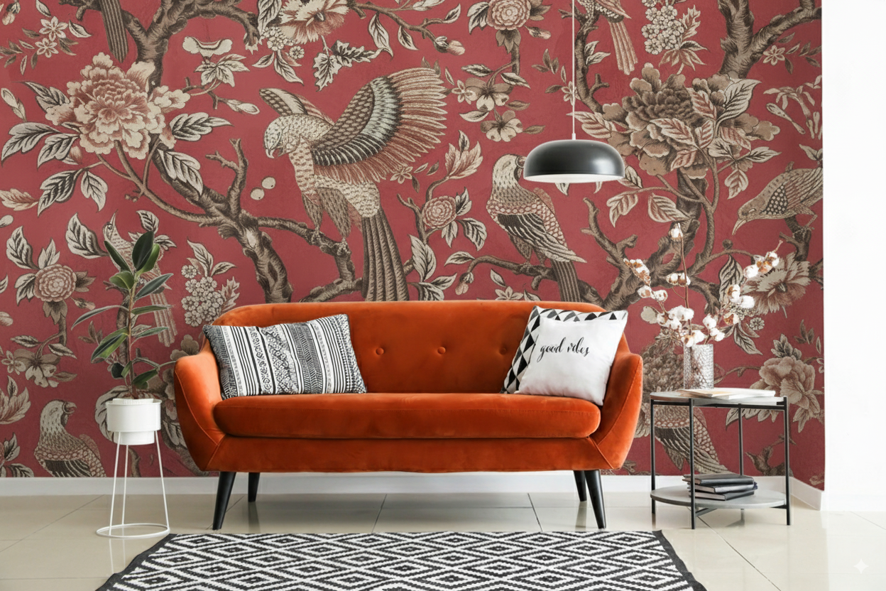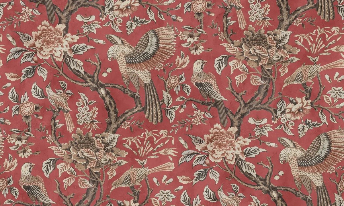 Este sofisticado fotomural recrea la opulencia de los tapices clásicos con un diseño rico en aves exóticas posadas entre ramas floridas sobre un elegante fondo rojo coral. La composición presenta una variedad de especies aviares finamente detalladas, acompañadas de peonías, crisantemos y follaje ornamental que se entrelazan creando un patrón continuo y armonioso.
