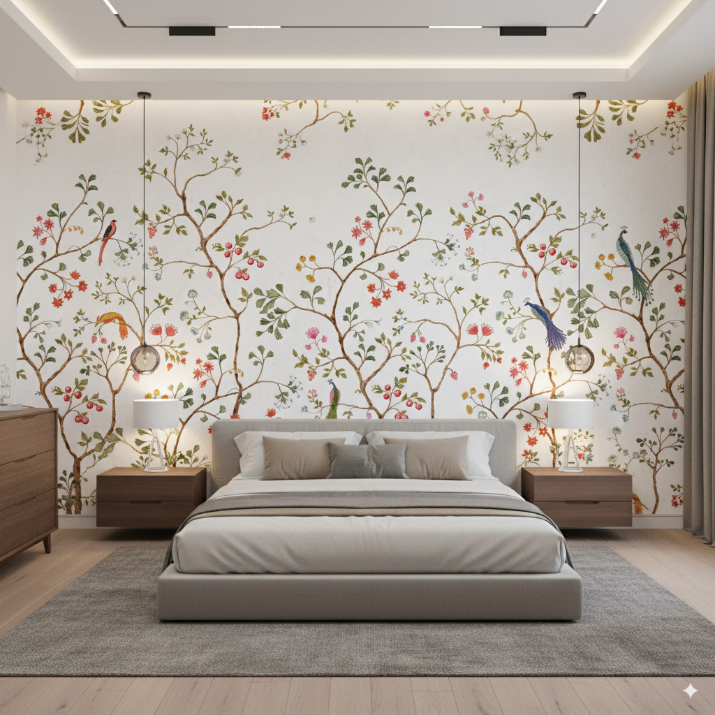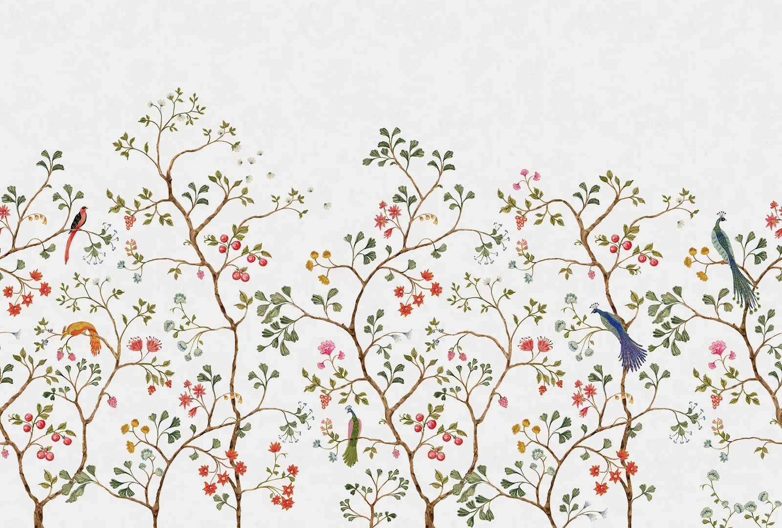 Despierta cada mañana en un jardín de ensueño con este espectacular fotomural que celebra la exuberancia de la primavera. El diseño presenta un ecosistema completo con árboles floridos, flores en múltiples colores (rojas, rosas, amarillas, azules), y una variedad de aves exóticas incluyendo tucanes, colibríes y aves tropicales. Las ramas se entrelazan creando una composición dinámica y llena de vida sobre un fondo blanco que hace que todos los colores brillen con intensidad. Este mural es perfecto para quienes aman la naturaleza vibrante y desean crear un espacio lleno de energía positiva y alegría. Transforma cualquier dormitorio en un santuario natural.