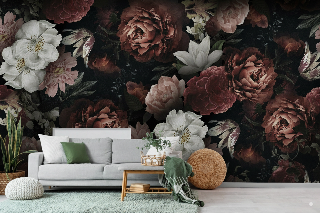 Este exquisito fotomural presenta una composición floral de estilo vintage con peonías de tonos rosados y rosas blancas delicadamente dispuestas sobre un fondo oscuro dramático. La paleta de colores en tonos dusty rose, blanco puro y verdes apagados crea una atmósfera romántica y sofisticada. Ideal para dormitorios principales, salas de estar elegantes o espacios comerciales que buscan transmitir lujo y feminidad. El diseño combina la belleza natural de las flores con un tratamiento artístico que evoca la elegancia del arte floral clásico.