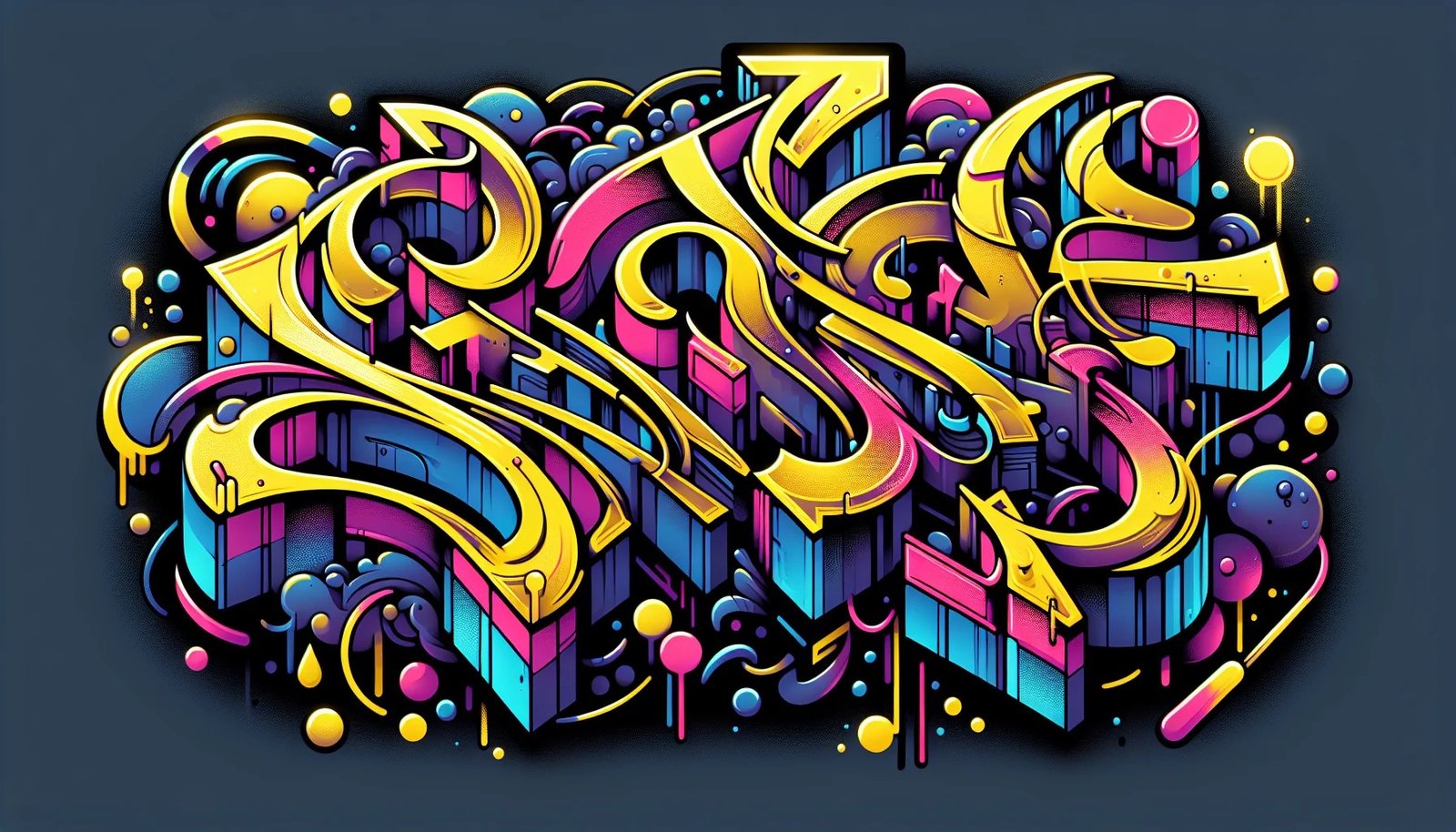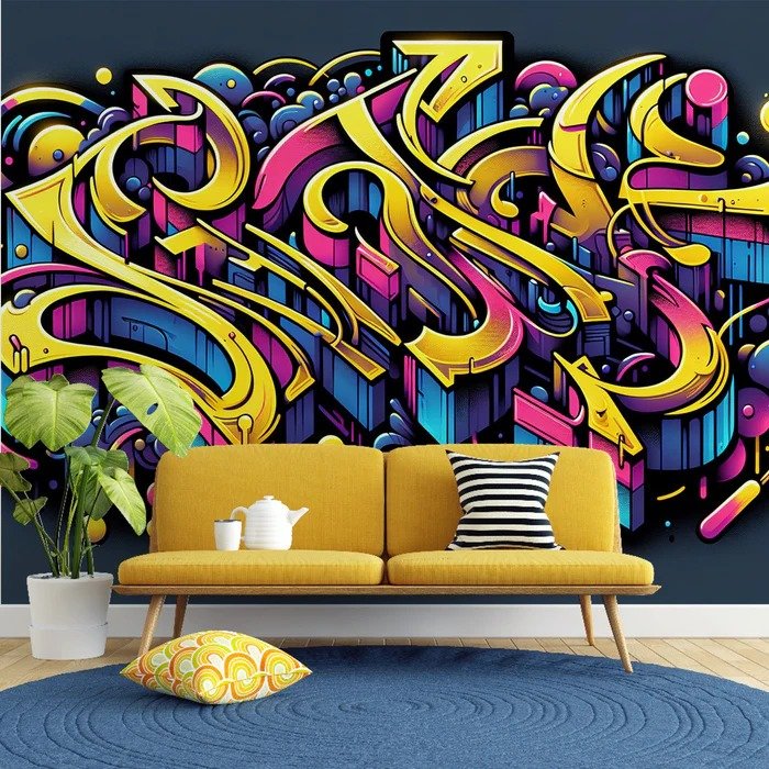 Espectacular mural con letras volumétricas en tonos dorados, amarillos y rosas sobre base oscura. Crea profundidad y dinamismo en cualquier espacio. Perfecto para salas de estar o estudios creativos que buscan personalidad única.
