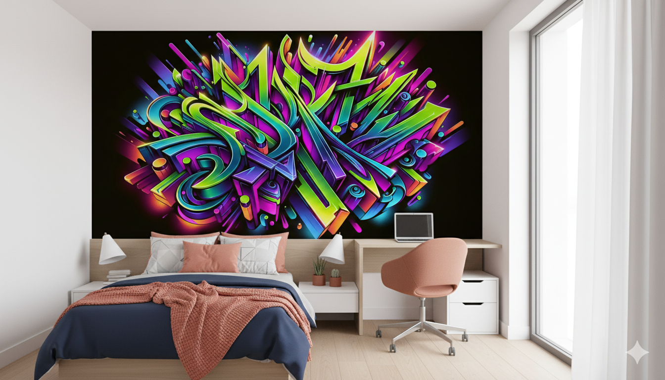 Espectacular fotomural de lettering abstracto estilo graffiti con efectos luminosos en tonos neón: amarillo, verde, morado, rosa y azul. El fondo negro intensifica los colores, creando un ambiente urbano y contemporáneo ideal para habitaciones juveniles modernas.