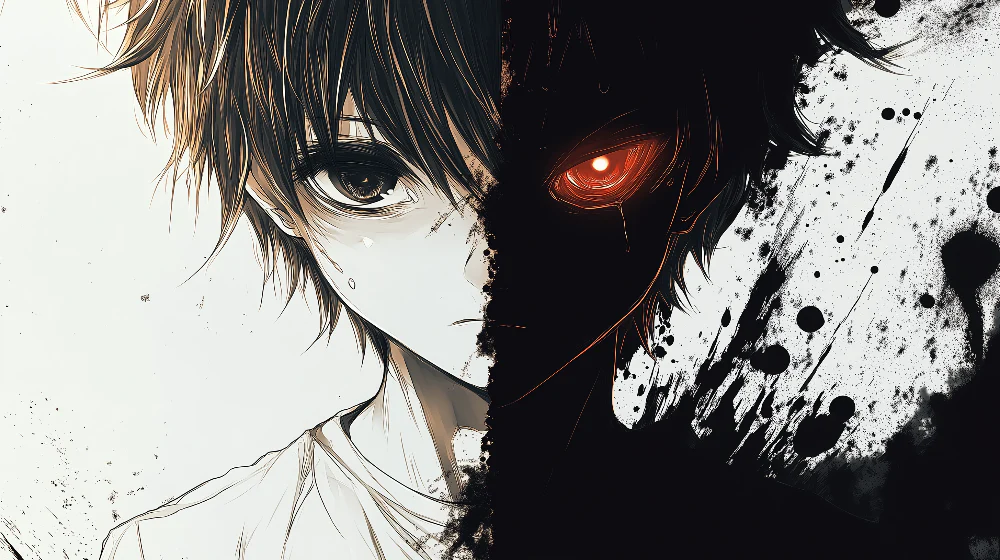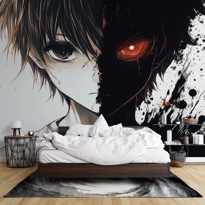 Diseño que representa dualidad interna con contraste entre luz y sombra en composición vertical dramática. Perfecto para jóvenes que exploran temas de identidad y transformación en su espacio personal.