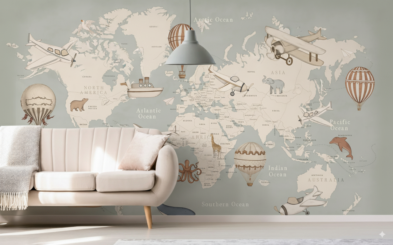 Este educativo fotomural presenta un mapamundi detallado en tonos sage y beige con los nombres de países y océanos, enriquecido con ilustraciones de animales representativos de cada continente: osos polares en el Ártico, elefantes en África, ballenas en los océanos y delfines. La composición incluye globos aerostáticos, aviones vintage y barcos que evocan el espíritu aventurero de los viajes.