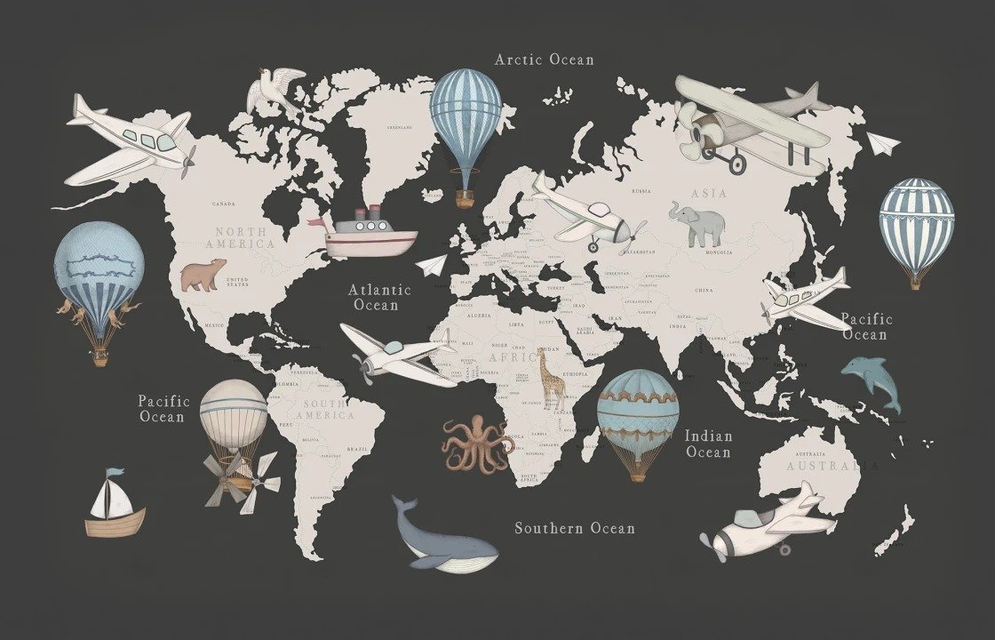 Fotomural educativo del mapamundi con animales de cada continente, globos aerostáticos y transportes sobre fondo oscuro, perfecto para crear un ambiente sofisticado y aventurero.
