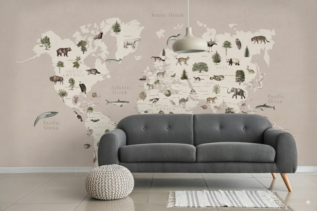 Este refinado fotomural combina cartografía clásica con ilustración naturalista en una paleta de colores suaves y elegantes. Sobre un fondo beige claro, se despliega un mapamundi detallado en tonos crema y arena, donde cada región geográfica se enriquece con representaciones artísticas de su biodiversidad única.