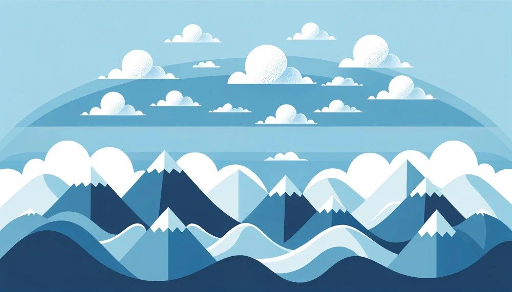 Fotomural minimalista con montañas estilizadas en tonos azules, nubes geométricas y diseño limpio contemporáneo.