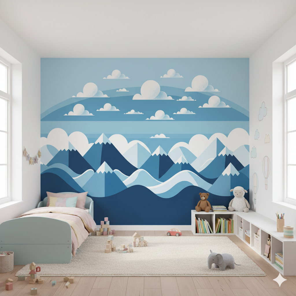 Este elegante fotomural presenta un paisaje montañoso interpretado con un enfoque minimalista y geométrico que combina serenidad natural con diseño contemporáneo. Las montañas se representan mediante formas superpuestas en diferentes tonos de azul, desde azul cielo hasta azul marino profundo, creando una sensación de profundidad y perspectiva sin complejidad visual. Las nubes blancas estilizadas flotan armoniosamente sobre los picos, añadiendo ligereza y movimiento a la composición estática. El cielo presenta un degradado suave que va desde azul claro en la parte superior hasta tonos más cálidos hacia el horizonte. Este diseño es perfecto para habitaciones infantiles modernas donde se busca una decoración que inspire calma y tranquilidad sin sobrecargar el espacio. La simplicidad geométrica del paisaje permite que los niños proyecten su imaginación mientras disfrutan de un ambiente visualmente relajante que favorece el descanso y la concentración.
