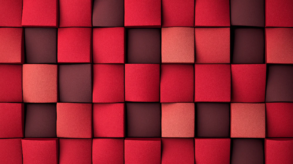 Cuadrícula de cubos hundidos en tonos rojos intensos con sombras profundas dinámicas