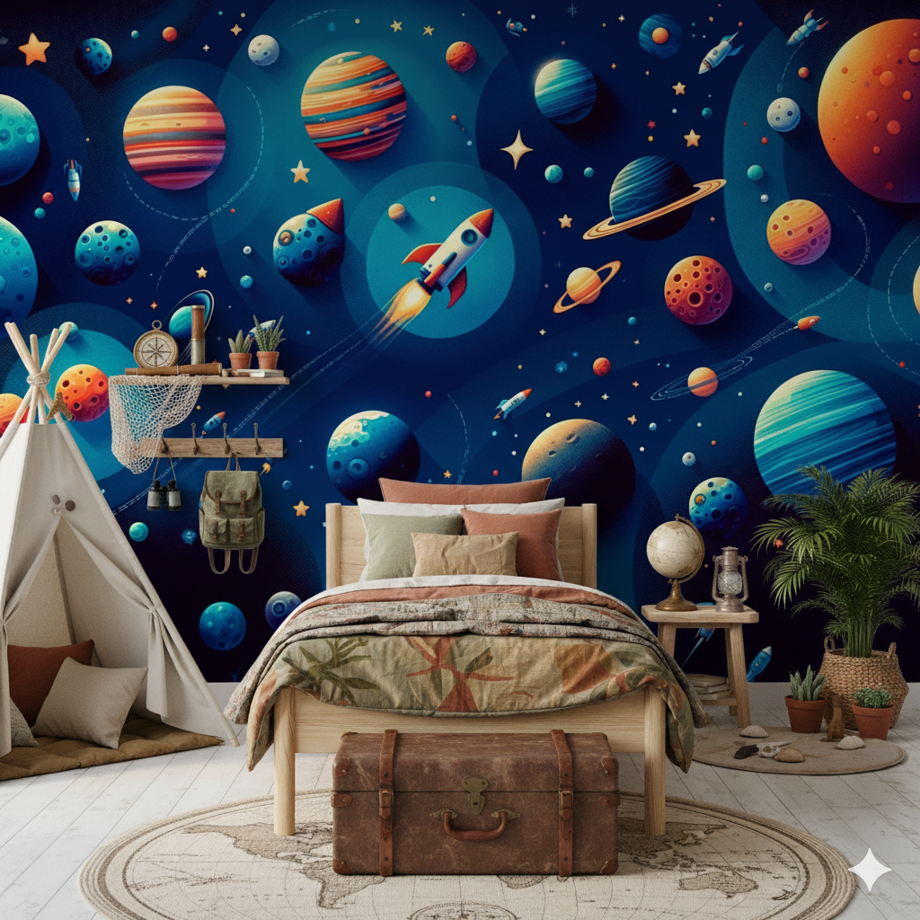 Este fascinante fotomural educativo convierte el aprendizaje del sistema solar en una experiencia visual cautivadora y accesible para los niños. La ilustración presenta todos los planetas del sistema solar representados con colores vibrantes y patrones únicos que facilitan su identificación y memorización, desde el pequeño Mercurio hasta el gigante Júpiter con sus característicos anillos. Cohetes retro en tonos rojos y azules navegan entre los planetas siguiendo órbitas curvas que conectan visualmente todo el sistema, mientras que estrellas doradas, cometas y asteroides añaden dinamismo y profundidad a la composición. El fondo en tonos azul profundo del espacio crea el contraste perfecto para que cada elemento destaque claramente. Los planetas se presentan con texturas y colores llamativos que los hacen memorables: Marte en tonos rojizos, la Tierra con sus azules y verdes característicos, Saturno con sus anillos dorados prominentes. Este fotomural no solo decora, sino que sirve como herramienta educativa permanente que estimula la curiosidad científica y el aprendizaje sobre astronomía. Es perfecto para habitaciones, aulas y espacios de estudio donde se busque combinar decoración atractiva con valor pedagógico, creando un ambiente que inspire el amor por la ciencia y la exploración del universo.