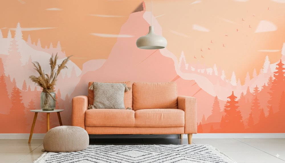 Esta ilustración minimalista presenta un paisaje sereno bañado en cálidos tonos naranjas que evocan la esencia pura del otoño. La montaña estilizada, complementada por un bosque en capas y una bandada de aves surcando el cielo, crea una escena tranquila y elegantemente simplificada. Perfecto para ambientes modernos y sofisticados, este fotomural aporta la paz de un entorno natural abstracto a cualquier espacio. La combinación de formas geométricas suaves y la paleta cromática otoñal transforman cualquier ambiente en un refugio de calma y contemplación estacional.